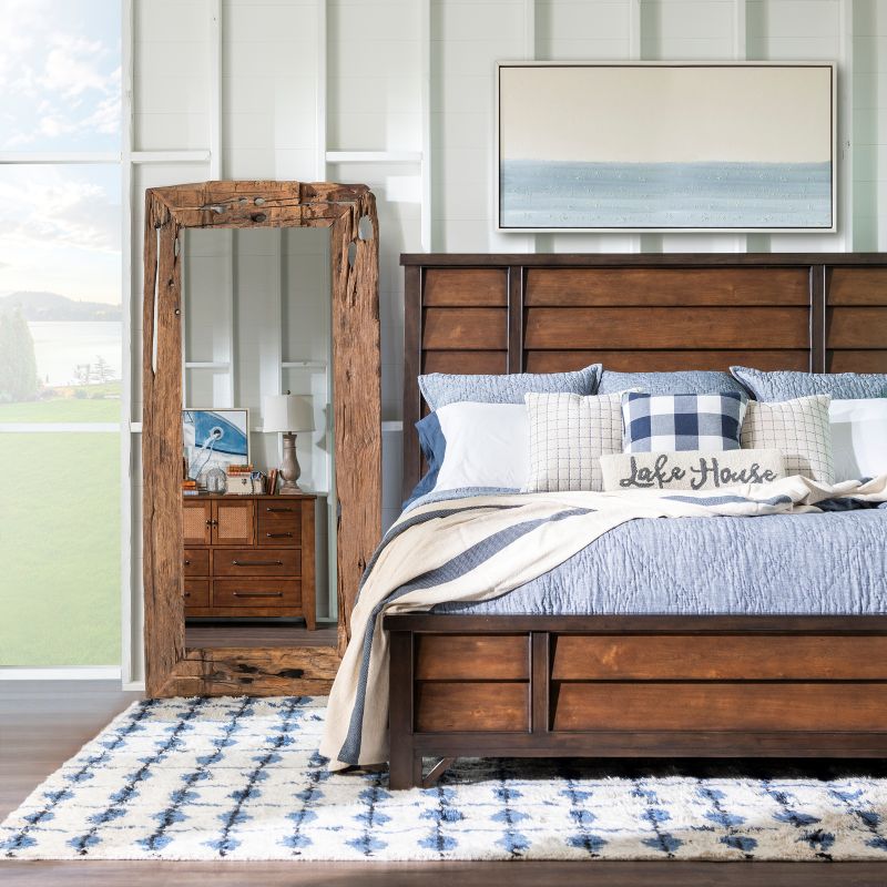 Made with rustic birch veneers and hardwoods, the core finishes in the Lake House collection include a midtone brown Pinecone finish, a darker Dried Tobacco tone and a neutral painted finish, Sail Cloth. Accent finishes available on select pieces include Sea Glass and Golden Hour.