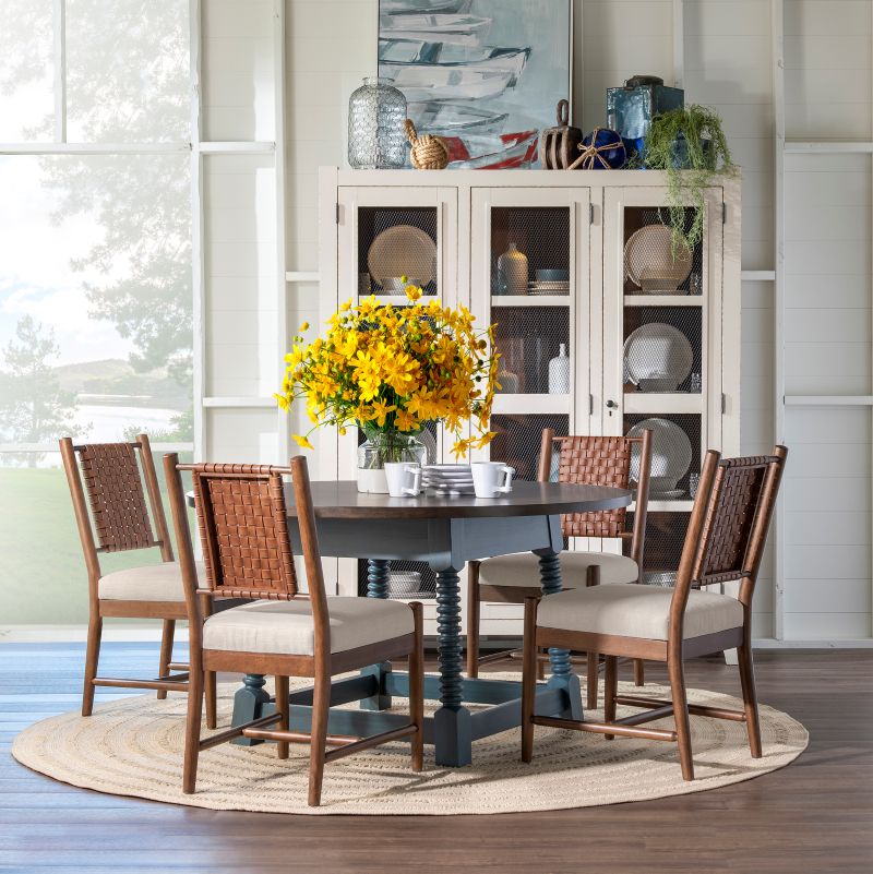In dining, there are four tables, including a plank-inspired trestle table and a round bobbin-base table, plus a mix of coordinating chairs and counter-height chairs and companion case pieces. Dining tables also are available in multiple finishes, including a two-tone application. Several multifunctional occasional, entertainment and accent items are also part of the collection.