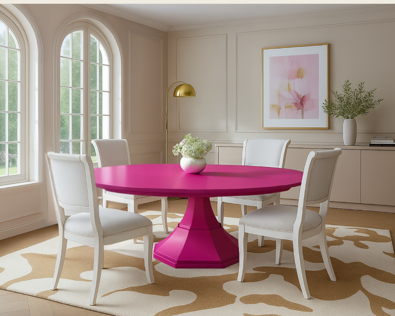 Its 60 new pieces include dining tables, occasional tables, chairs, along with several Jupe tables, accent tables and decorative credenzas sporting new finishes and fancy veneers.