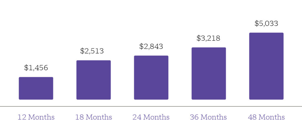 To see if this pattern held for other types of financing promotions, we compared the purchases of Wells Fargo Home Furnishings cardholders who used 0% APR with Equal Payments plans with terms ranging from 12 to 48 months. Once again, we found that an increase in plan length correlated with an increase in ticket size. In this group, we found that average ticket size increased by over $300 for each additional 12 months of financing. The most dramatic increase was seen when comparing 36- and 48-month 0% APR with Equal Payments plans, as customers who used the 48-month plan spent an average of over $1,800 more compared to customers who used the 36-month plan.²