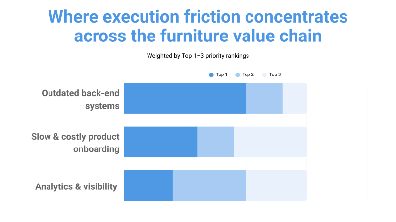 The survey results reflect input from more than 50 executives and senior leaders across sales, marketing, operations and information technology, representing over 30 leading furniture brands. Together, their responses paint a clear picture of where the industry is investing — and perhaps more importantly, where execution appears to break down.