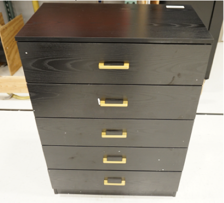 The units are 38.6 inches tall, 15.7 inches wide and 26 inches across the front and weigh about 66 pounds. The come in white, black and brown finishes and have five drawers. The units are not labeled.