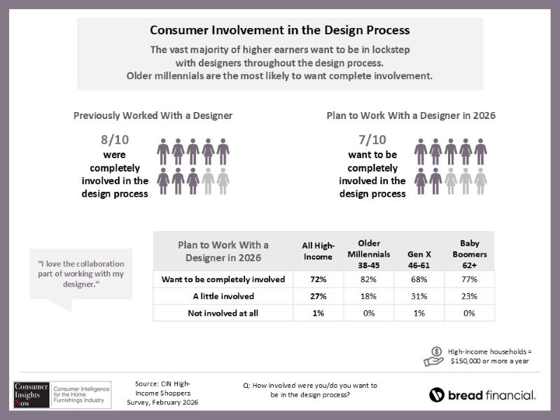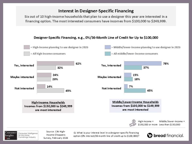 In fact, one of the key takeaways is that higher-income consumers are highly interested in designer-specific financing, including a 0%, 36-month line of credit of up to $100,000. Some 62% of those higher earners that plan to use a designer this year said they were interested in such financing, compared with 24% who said they might be interested and 14% that said they were not.