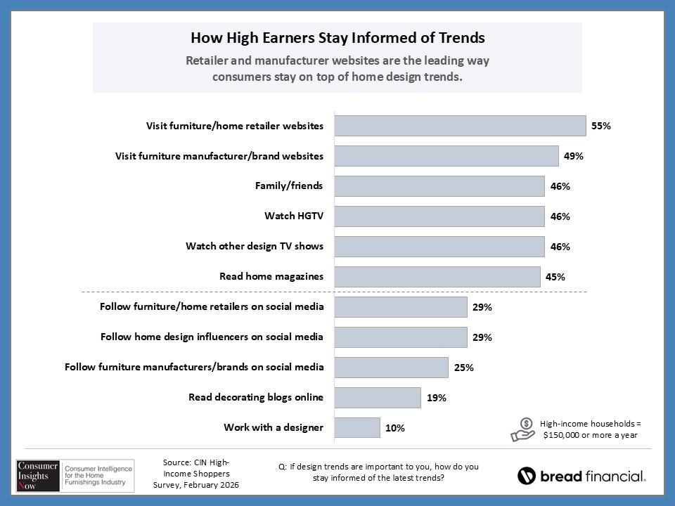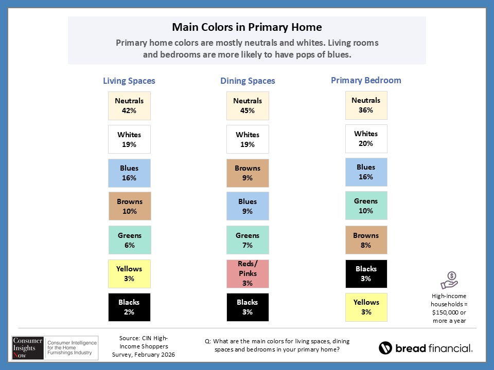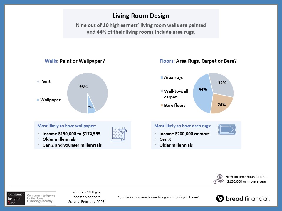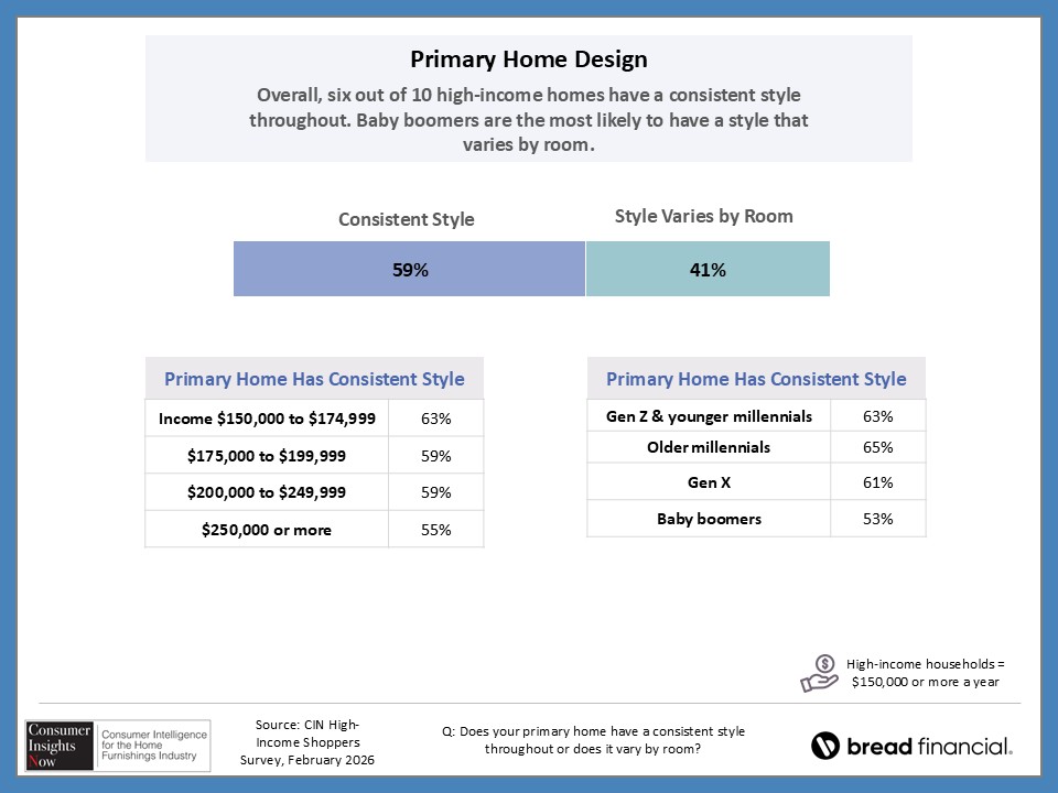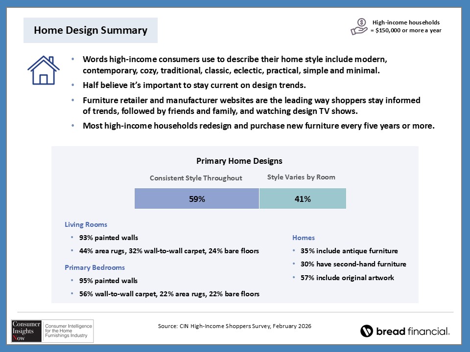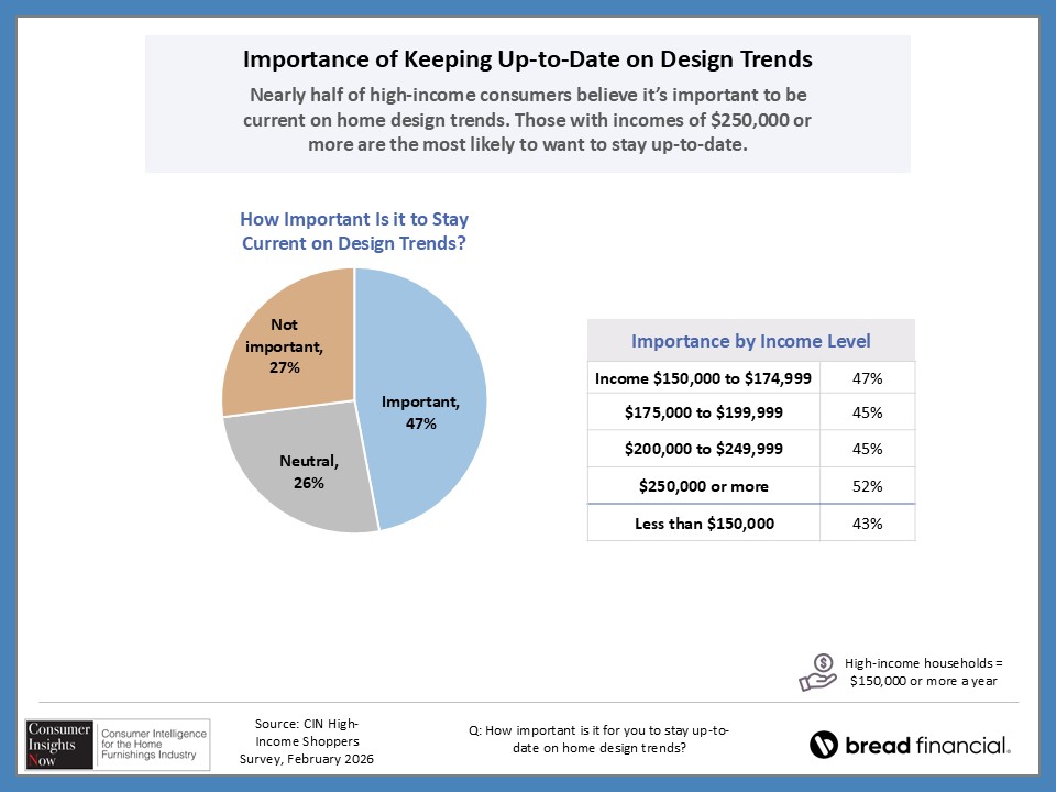 In our ongoing Consumer Insights Now research, sponsored by Bread Financial, we asked high earners making more than $150,000 about their home style preferences and how that impacts their shopping habits. With nearly half of those surveyed saying it’s important to keep up with design trends, they also revealed how they stay informed of those trends and how frequently they redecorate their home. This and more, including the choices they make regarding color and may surprise you as there are some similaries and differences by region and room in the home.