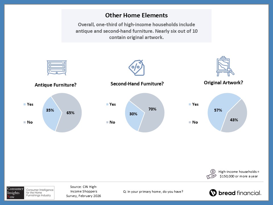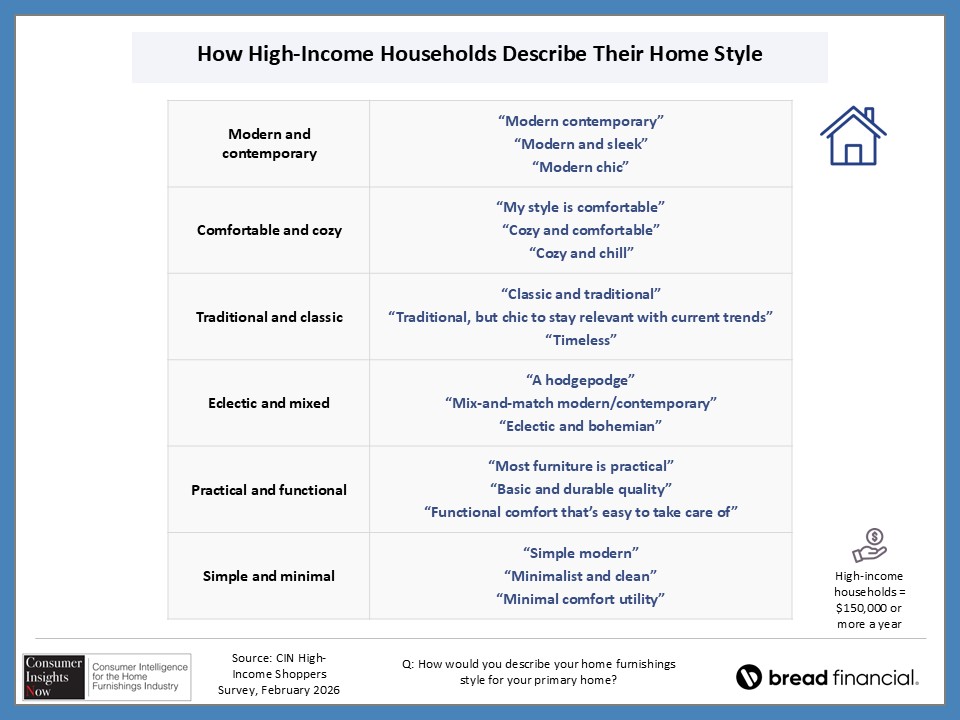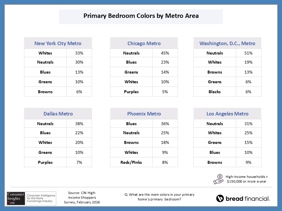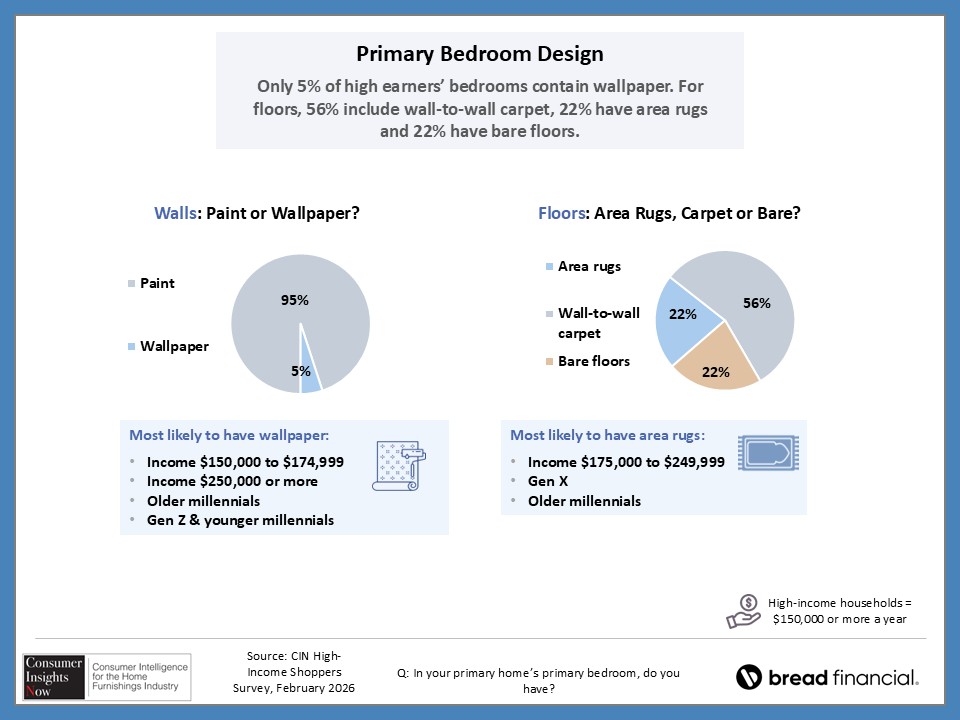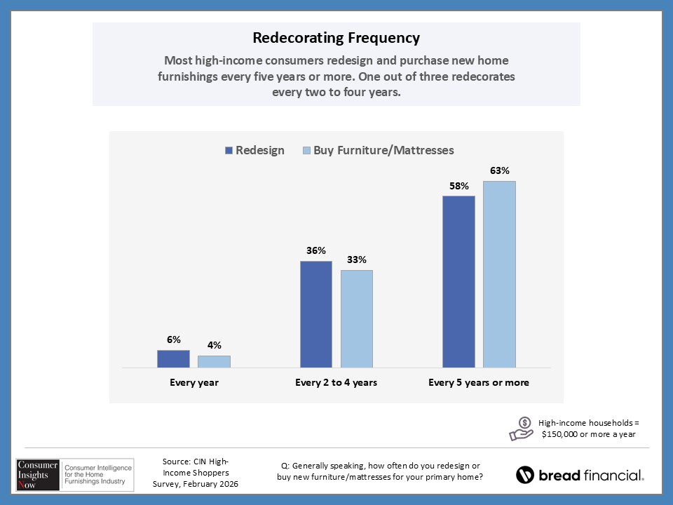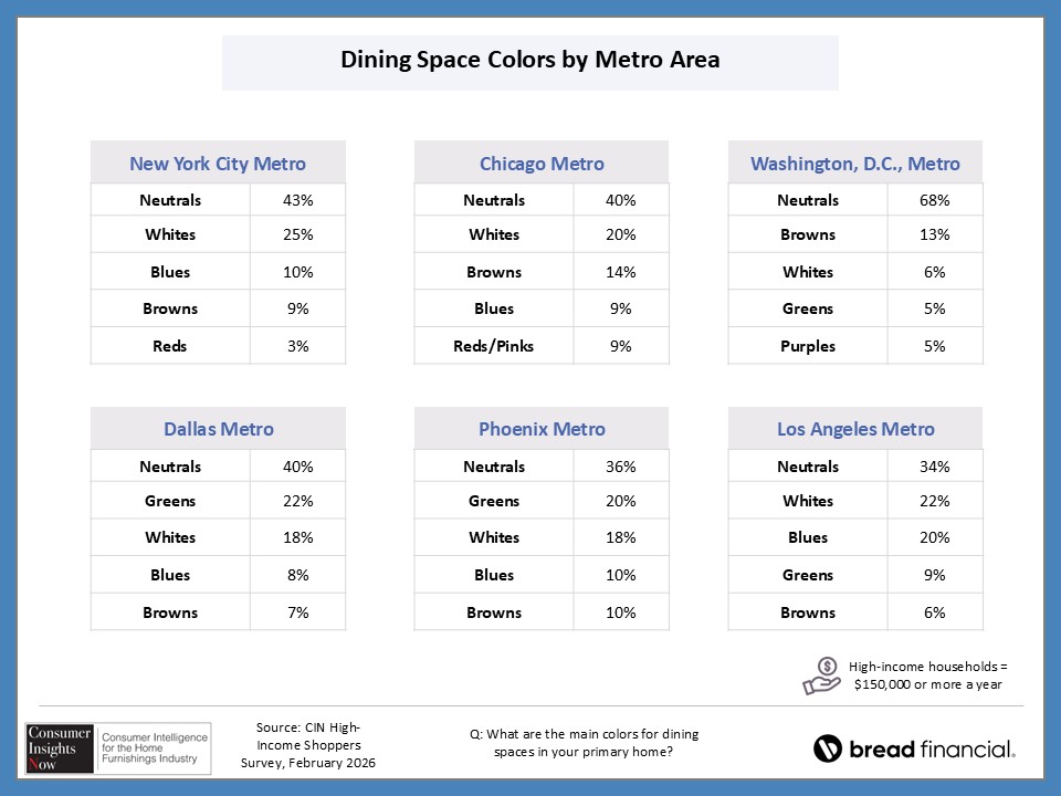In our ongoing Consumer Insights Now research, sponsored by Bread Financial, we asked high earners making more than $150,000 about their home style preferences and how that impacts their shopping habits. With nearly half of those surveyed saying it’s important to keep up with design trends, they also revealed how they stay informed of those trends and how frequently they redecorate their home. This and more, including the choices they make regarding color and may surprise you as there are some similaries and differences by region and room in the home.